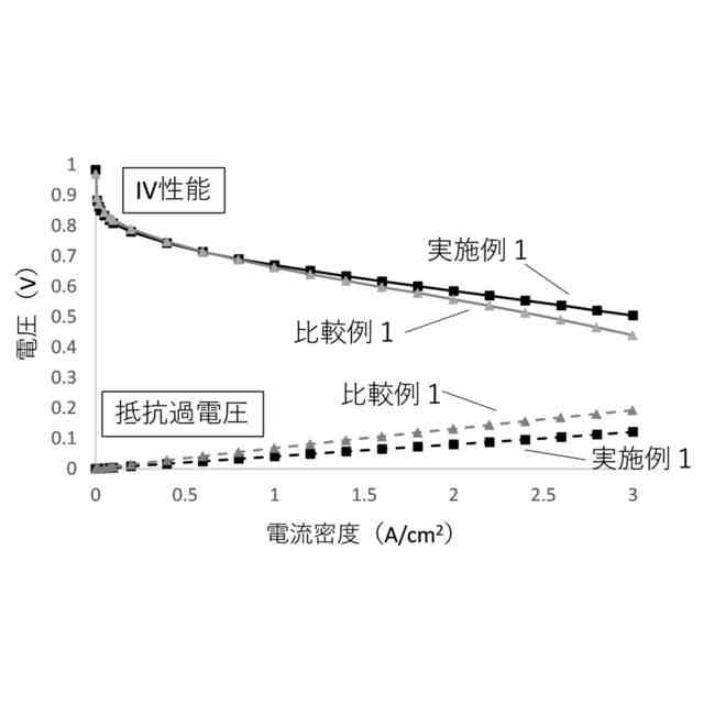 実施例1及び比較例1のMEAを使用したPEFC(単セル)のIV特性及び過電圧特性である。