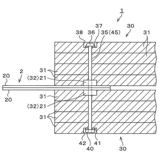 しかしながら、先願技術は、ボルトにせん断力(鋼製部材と木製部材との横ずれに抗する力)が集中する構成であり、ボルトを破損する恐れがあり、そのためにボルトを太くしなければならない。また、シア部材を木製部材に貫通させて設けているため、木製部材にシア部材と同等径の貫通孔を形成させる必要がある。そのため、貫通孔周りでの木製部材の断面欠損が大きくなり、木製部材自体の断面を大きくする必要がある。さらに、先願技術では、ボルト(ナット)が緩むと必要な摩擦力が得られなくなり、ボルトにせん断力が集中する可能性がある。
