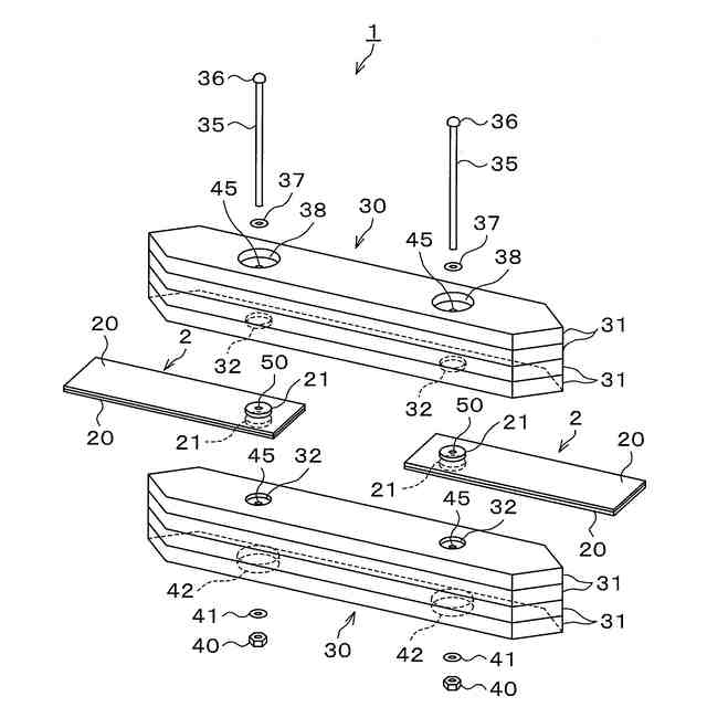 先願技術の構成は、少なくとも1枚の鋼製部材に複数の木製部材又は集成材を締結ボルトで固定し、前記木製部材又は集成材が表面側に配置するようにし、各木製部材又は集成材に、少なくともシア部材を配置する部分の孔を孔軸方向に同内径とした円形の貫通孔を少なくとも1つ設け、その貫通孔に、その内径と同径か僅かに大きくした外径で軸方向全長にわたり同外径としたシア部材を配置すると共に前記鋼製部材に当接配置し、表面側に配置された木製部材又は集成材における前記貫通孔に配置されたシア部材の外側に押え部材が配置され、前記鋼製部材と各シア部材と各押え部材のボルト挿通孔に挿通配置した締結ボルトの締付け力により各シア部材を鋼製部材に圧着して摩擦接合すると共に、前記各押え部材により表面側の木製部材又は集成材のはずれ止めを図るようにしたことを特徴とする木製部材と鋼製部材からなる複合部材である。