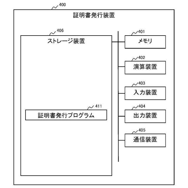 証明書発行装置が備えるハードウェア構成及び機能(プログラム)の一例を示す図である。