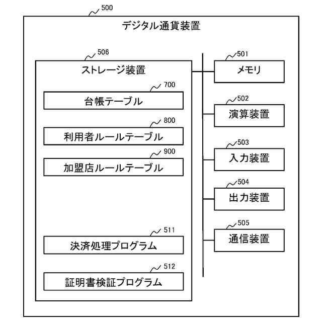 デジタル通貨装置が備えるハードウェア構成及び機能(プログラム)の一例を示す図である。