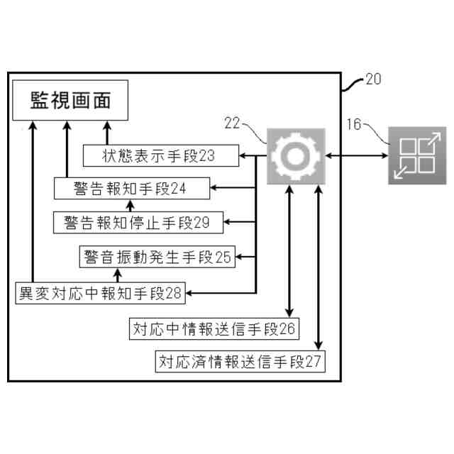 監視者端末は、異変対応中情報を受信したとき、警音振動発生手段の作動を停止し、監視画面に受信した端末IDに対応する監視者が異変対応中であることを表示し、また、異変対応済情報を受信したとき、警告報知手段の作動を停止する。