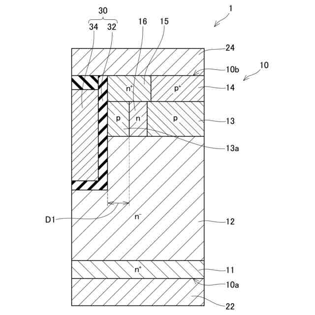 図1に、第1実施形態の半導体装置1を示す。半導体装置1は、MOSFET(Metal Oxide Semiconductor Field Effect Transistor)と称される種類の半導体装置であり、第1主面10aと第2主面10bを有する半導体基板10と、半導体基板10の第1主面10aを被覆しているドレイン電極22と、半導体基板10の第2主面10bを被覆しているソース電極24と、半導体基板10の上層部に設けられているトレンチ型の絶縁ゲート30と、を備えている。ここで、第1主面10aと第2主面10bは、半導体基板10の表面のうち平行な関係で延びている一対の面であり、半導体基板10の厚み方向(この例では、紙面上下方向)に直交する面である。