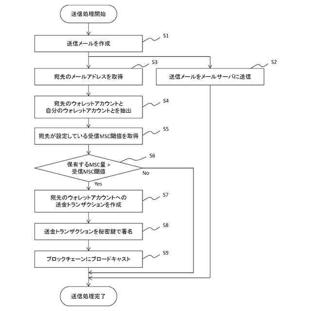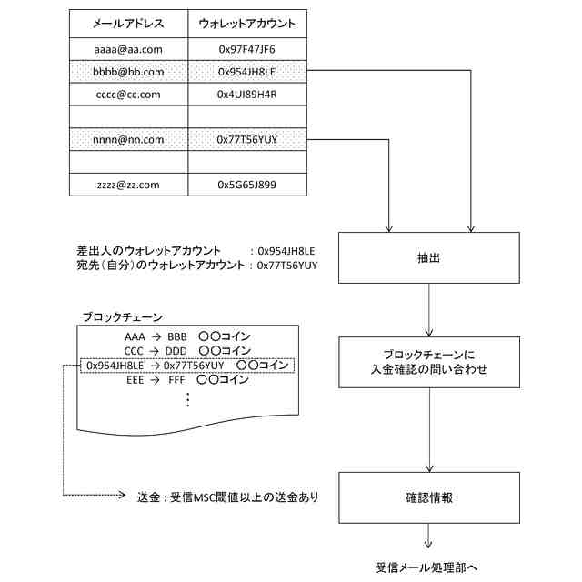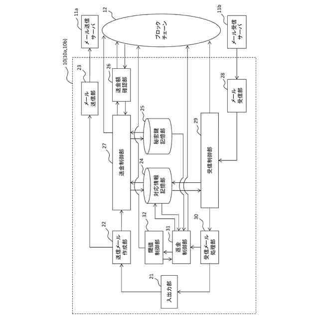 【解決手段】一のアカウントから他のアカウントに電子メールを送信するメール送信部23と、電子メールを送信する場合に一のアカウントから他のアカウントに仮想通貨を送金する送金トランザクションを生成し、ブロックチェーン12にブロードキャストする送金制御部27と、他のアカウントから一のアカウントに送信された電子メールを受信するメール受信部28と、電子メールを受信する場合に、他のアカウントから一のアカウントへの仮想通貨の入金状態をブロックチェーン12にアクセスして確認し、確認された入金額が所定の閾値以上の金額である場合に電子メールを正当な電子メールとして受信する受信制御部29と、正当な電子メールを受信した場合に、仮想通貨を返金する返金制御部31と、受信した電子メールの種別に応じて閾値を調整する閾値制御部32とを備える。