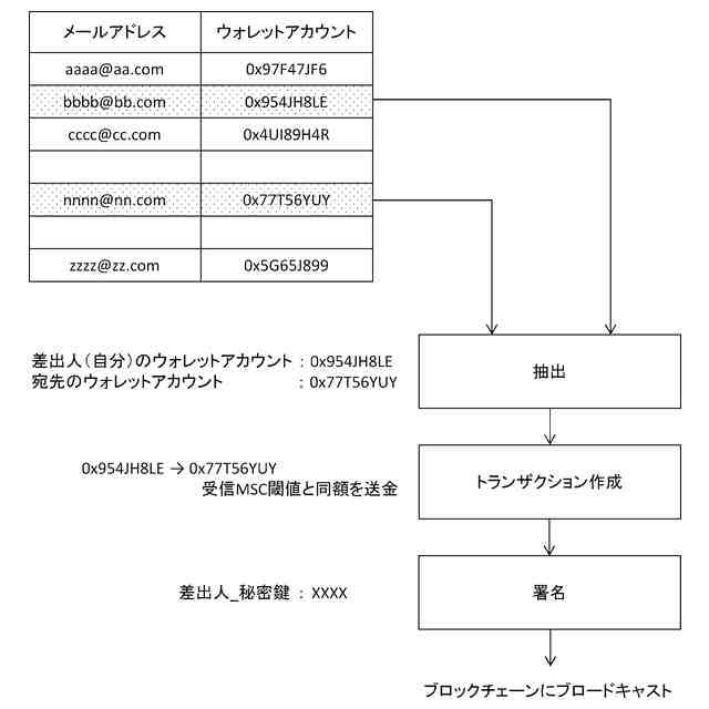 前記メール送信手段が前記電子メールを送信する場合に前記一のアカウントから前記他のアカウントに前記仮想通貨を送金する送金トランザクションを生成し、ブロックチェーンにブロードキャストする送金制御手段と、