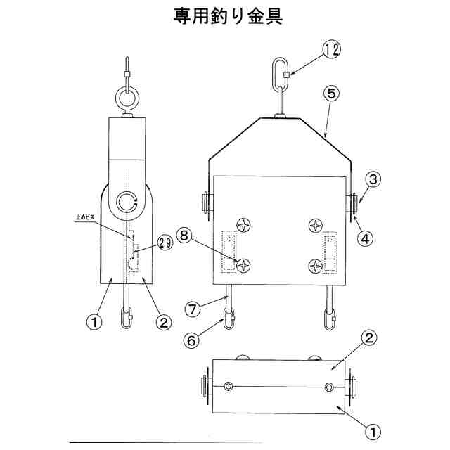 専用釣り金具 専用釣り金具でシャフト3にロープ7を巻きつけてブロック1と2を合わせて止めビス8で止めロープ収納します。板バネ29はロープ7が専用金具5の内部での絡み防止するための、弱い板バネ29が取り付けられています。