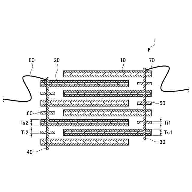 前記第1絶縁部材の厚さTi1と、前記第2シート部材の厚さTs2との比Ti1/Ts2、及び前記第2絶縁部材の厚さTi2と、前記第1シート部材の厚さTs1との比Ti2/Ts1とが、それぞれ0.8以上1.2以下である