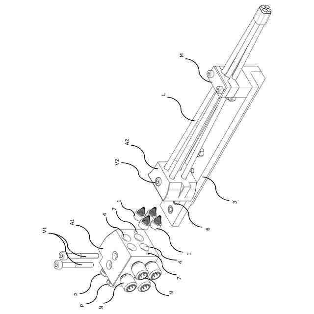 図1aおよび図1bは、欧州特許出願公開第2226416号明細書によって開示された技術的解決策による4つの主発射ノズルを有するノズルアセンブリを示す。ノズルアセンブリは、それぞれの緯糸を制御する各主ノズルのために1つずつ、収束軸を有するいくつかの円筒形の座部S(シートS)を備えた支持体Aを有する。それぞれインジェクタPを含む圧縮エアジェットを形成する部品は、このような各座部Sの緯糸入口側に挿入される。これは、緯糸を内部に導き、その外面で圧縮エアの流れを適切に伝えて、緯糸の周囲に正しく向けた圧縮エアジェットを得るように設計された装置である。支持体Aからの緯糸出口側には、前記各座部Sに緯糸発射部品が密封状態で挿入されている。緯糸発射部品は、基体Cと直線発射チューブLとを有し、前記発射チューブLは、それらの端部をリードR発射チャネルの口に近接した安定した位置に保持するヘッドクランプMに向かって収束している。圧縮エアは、支持体Aの内部に形成され、支持体Aの側壁にある開口部Oで終わる特殊なダクトを介して座部Sに送られる。最後に、圧縮エアを供給するフレキシブルチューブTを迅速に連結できるように、開口部OにクイックカップリングNが取り付けられる。欧州特許出願公開第2226416号明細書に開示された発明は、正確には、前述のブラシ手段1を発射チューブLの基体Cに挿入することにある。