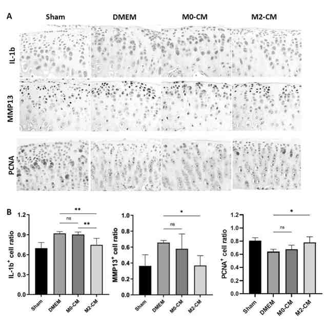 M2-CM、M0-CMまたはDMEMを静脈投与したマウスTMJOAモデルにおいて、顎関節のIL-1b、MMP13およびPCNAを免疫組織染色により測定した結果を示す。