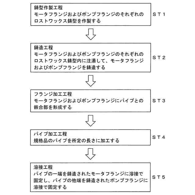 前記モータフランジおよび前記ポンプフランジのそれぞれの前記ロストワックス鋳型内に注湯して、前記モータフランジおよび前記ポンプフランジを鋳造する鋳造工程と、