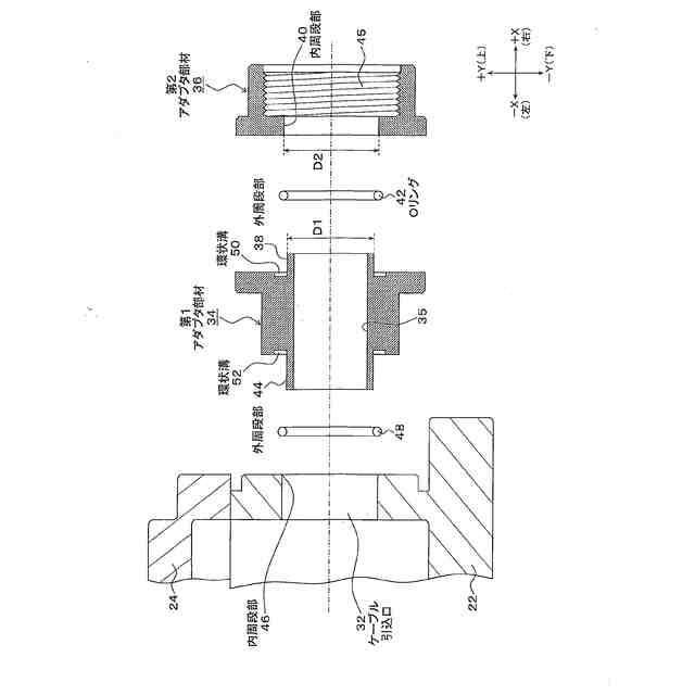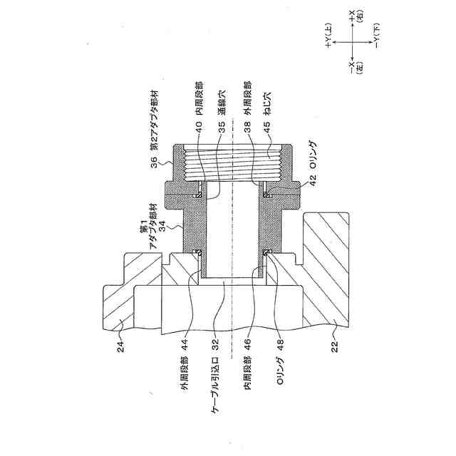 図11は従来の防水構造の一例であり、防水構造は筐体側の第1部材100とケーブル接続側の第2部材102で構成され、第1部材100には通線穴を有する外周段部104が設けられ、第2部材102には通線穴を有する内周段部106が設けられ、外周段部104と内周段部106の間にはOリング108が配置され、第1部材100に第2部材102を軸方向で締付け固定することで、Oリング108を密着させた防水構造としている(特許文献1,2)。