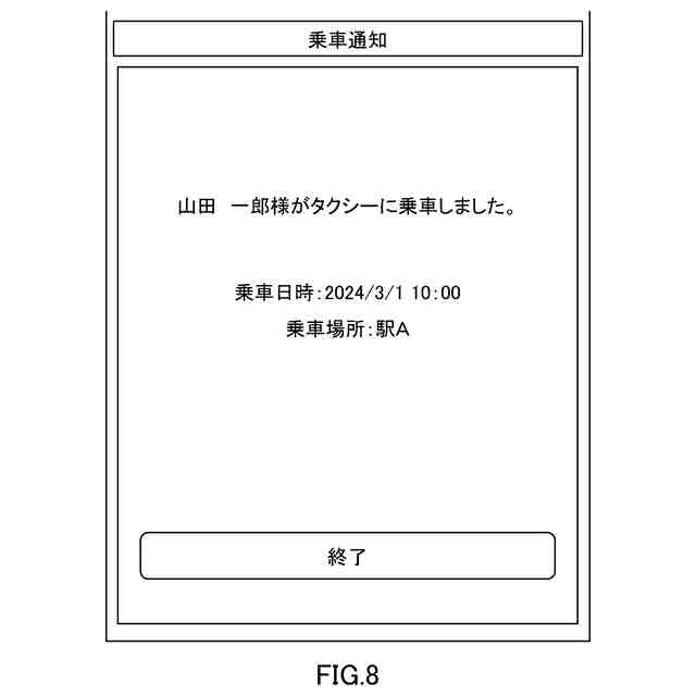 タクシーを対象としたサブスクリプションサービスが始まっている。当該サブスクリプションサービスの利用者として、学校や病院に通う子供や高齢者が想定される。ここで、子供や高齢者の家族は、子供や高齢者が正しくタクシーに乗車したか否か、タクシーから降車したか否かを気遣うことが多い。