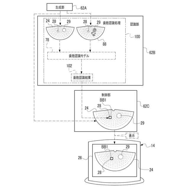 特許文献2に記載の超音波診断装置において、デブリ特定部は、第1の超音波画像から特定された嚢胞と第2の超音波画像から特定された嚢胞を互いに位置合わせした状態で、デブリの特定を行う。特許文献2に記載の超音波診断装置において、デブリ特定部は、第1の超音波画像および第2の超音波画像をそれぞれ画像認識することにより、同一の嚢胞を撮像していることを判定する同一判定部を含む。特許文献2に記載の超音波診断装置において、同一判定部は、第1の超音波画像および第2の超音波画像を入力とする学習済み判定モデルにより、同一の嚢胞を撮像していることを判定する。