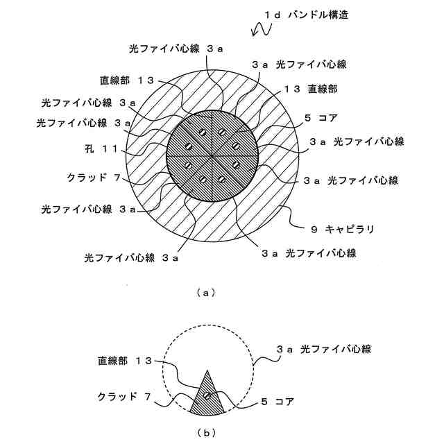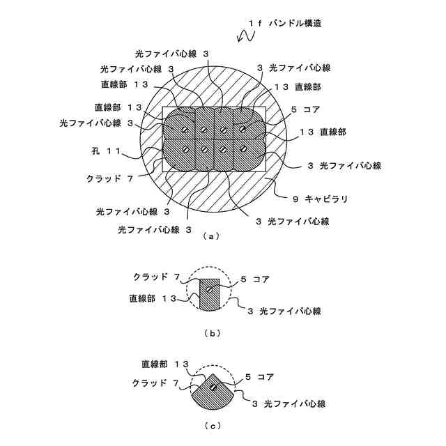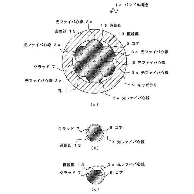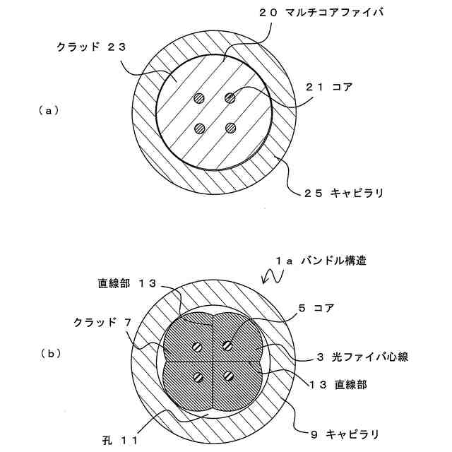このようなマルチコアファイバ100と光接続を行うために、図10(b)に示すように、細径の光ファイバ心線107をガラス製のキャピラリ113に挿通したバンドル構造110が用いられる。それぞれの光ファイバ心線107は、クラッド111の中央にコア109が配置された単心の光ファイバであり、図示した例では、2本の光ファイバ心線107がキャピラリ113に挿通される。