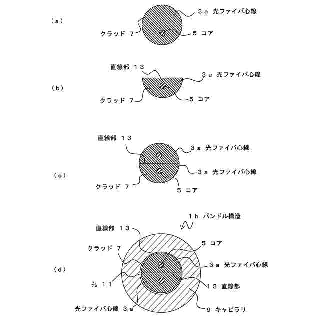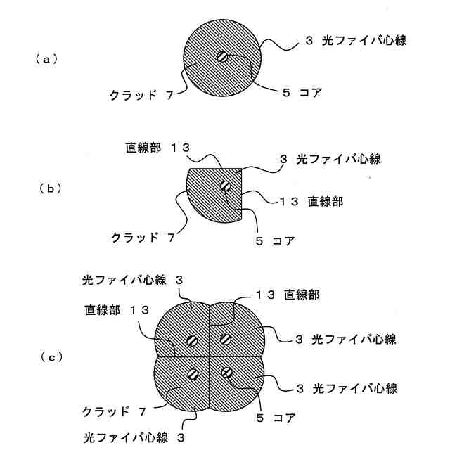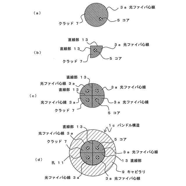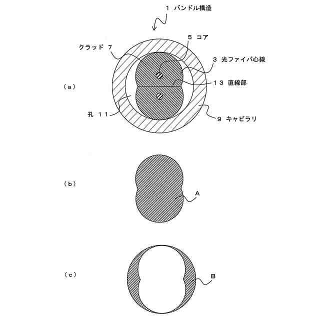 【解決手段】 バンドル構造1は、二本の光ファイバ心線3とキャピラリ9等から構成される。光ファイバ心線3は、コア5とコア5を覆うクラッド7を有する単心の光ファイバである。それぞれの光ファイバ心線3は、軸方向に垂直な断面の外形が円形ではなく、外周部の一部に直線部13が形成される。また、それぞれの光ファイバ心線3は、互いの直線部13同士が対向するように配置される。すなわち、断面において、光ファイバ心線3同士は線接触する。それぞれの光ファイバ心線3は、キャピラリ9の孔11に挿通される。