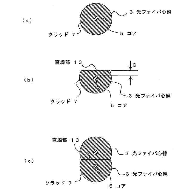 図10(a)は、マルチコアファイバ100をガラス製のキャピラリ105に挿通した状態を示す断面図である。マルチコアファイバ100は、略円形のクラッド103の内部に、複数のコア101が配置される。例えば、図示した例では、クラッド103の内部に、コア101が二つ配置される。