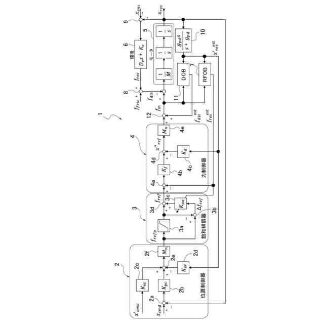制御対象が制御対象以外の物体に接触し、かつ、制御対象が前記物体に接触する接触力の許容可能な上限値または下限値が力参照値以下または以上のときには、力参照値を前記上限値または下限値に制限した制限値を力要求値として出力し、制御対象が前記物体に接触し、かつ、前記上限値または下限値を力参照値が超えないまたは下回らないとき、並びに、制御対象が前記物体に接触していないときには、力参照値を力要求値として出力する飽和補償器と、