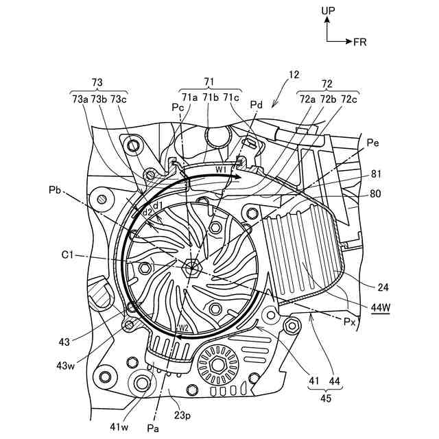 ところで、強制空冷ファンの効率化を促進するには、遠心ファンの送風空気への補機の影響を抑えることや、補機の回転抵抗が送風空気の影響で増大する事態を防ぐことが望まれる。