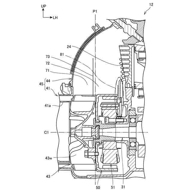 シリンダー軸線を水平に横切る面でパワーユニット内を示す図である。