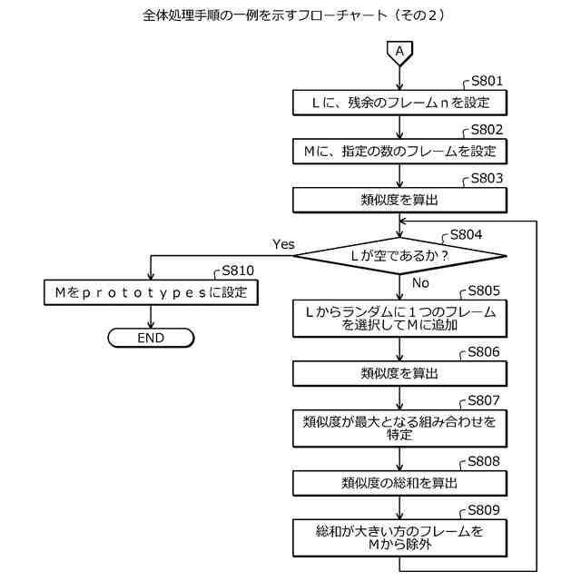 特定した前記残余のフレームのそれぞれについて、当該フレームと特定した前記残余のフレームのうちの他のフレームのそれぞれとの前記所定の種類の特徴量の類似度合いを表す指標値の総和を算出する、