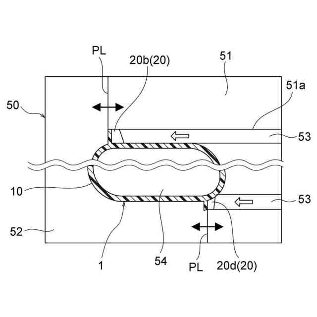 本発明において、前記樹脂成形品は、前記中空部を有する本体部と、前記本体部から突出する少なくとも1つの突出部とを有し、前記突出部は、前記押圧面と、前記押圧面から前記金型の開閉方向に対して交差する方向に延びる保持部とを有することが好ましい。