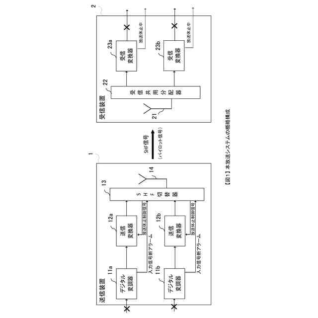 SHF切替器33は、デジタル変調器31a,31bの両方から入力信号断アラームが入力された場合には、放送休止と判断して、放送変換器32a,32bにSHF信号の出力を停止するよう制御信号を出力する(停止制御信号)。これにより、送信装置からのSHF信号の出力は停止する。