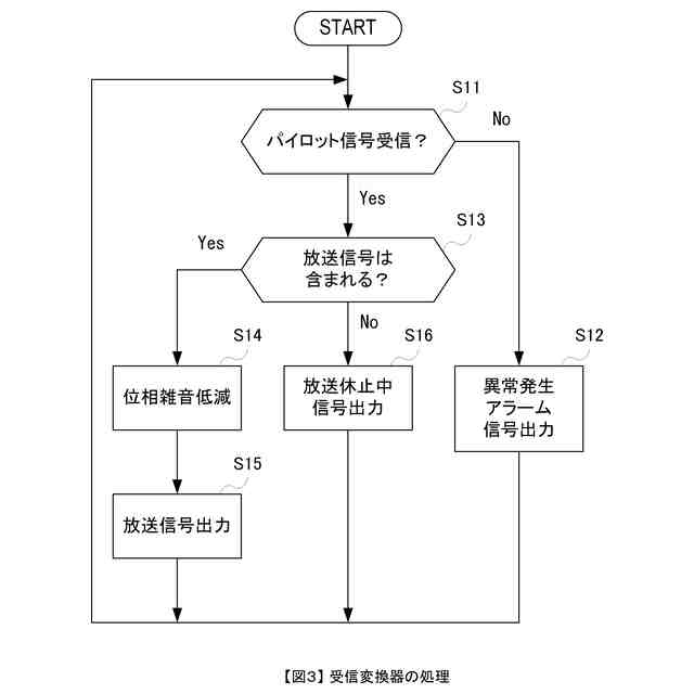 前記第1の受信変換器が、前記IF信号の位相雑音を前記付与されたパイロット信号を用いてキャンセリングし、前記パイロット信号のみを受信した場合には放送休止中の信号を出力し、前記パイロット信号を受信しなかった場合には、異常発生の信号を出力し、