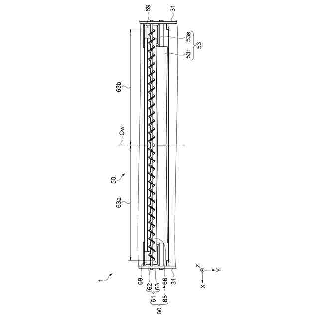 前記スパイラルは、前記シャフトの前記長手方向における中央部から一方の端に向かう第1スパイラルと、前記中央部から他方の端に向かう第2スパイラルと、を有し、前記第1スパイラルと前記第2スパイラルとは巻き方向が異なり、