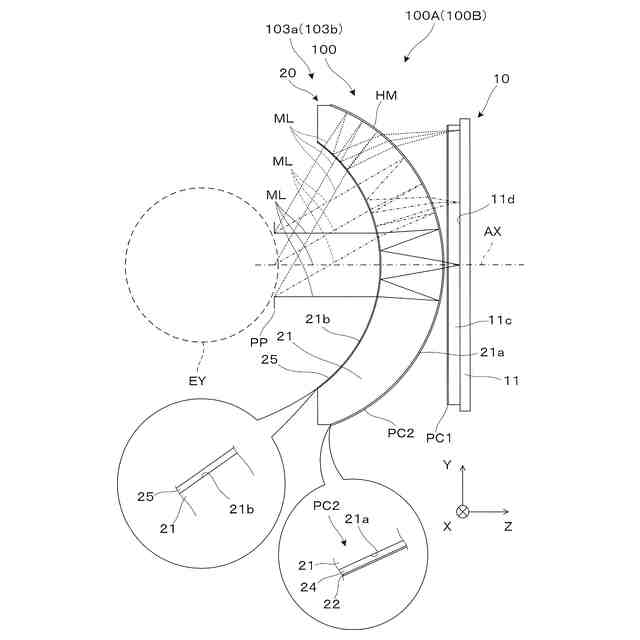 なお、上記特許文献1の装置は、フレネルタイプのレンズを内蔵する平板を結像系として用いているが、平板に代えてメニスカスレンズを用いることも考えられる。しかしながら、平板に代えてメニスカスレンズを用いる場合、曲面上に透過反射選択部材を構成する1/4波長板を形成することになり、その湾曲により、1/4波長板の複屈折特性が変化し、所望の位相差効果が得られない可能性がある。また、1/4波長板を貼り付ける際に複屈折特性に影響を与える可能性もある。