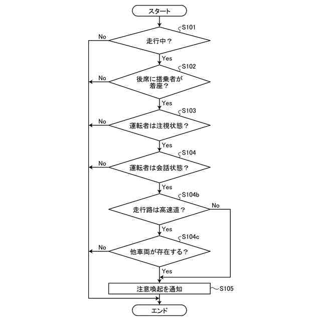 しかしながら、運転者の脇見運転には種々の形態があり、従来技術は、その形態に対応するものではなかった。脇見運転の形態としては、例えば、後席に搭乗者がいる場合に、運転者はバックミラーで後席の搭乗者を見ながら会話に夢中になるというものがある。このときの運転者は、運転における注意力が散漫になる可能性があるため、注意喚起を通知することが好ましい。
