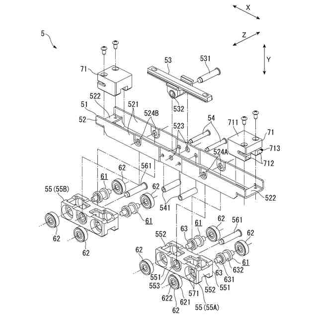 戸車5は、図2から図5に示すように、戸車枠51と、戸車枠51に回転可能に支持される車輪61とを備えている。戸車枠51は、下框32に取付部材53を介して取り付けられる外枠52と、レール221の長手方向であるX軸方向に沿って外枠52に並設された二つの内枠55(55A,55B)とを備えている。