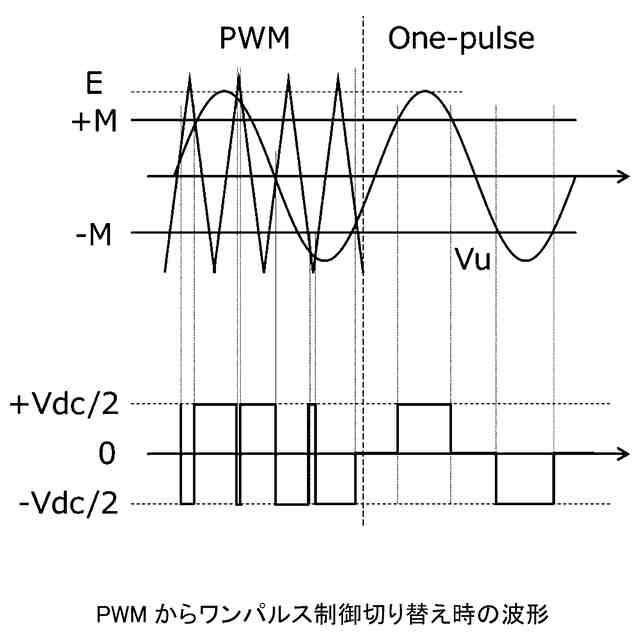 【解決手段】無効電力指令から求めた出力電圧振幅Eと、同期発電機の運動特性を模擬した制御を行って得た出力位相θmを基に、GFMインバータ3の出力電圧指令Vrefを生成する出力電圧指令生成部13と、前記Eを用いて、正弦波半周期に1パルスのゲート信号を出力させるためのワンパルス制御指令±Mを生成するワンパルス制御ブロック16と、電流比較部17の比較結果が出力電流>出力電流閾値であるとき、三角波生成部14の三角波信号からワンパルス制御ブロック16のワンパルス制御指令±Mに切り替えるキャリア選択部18と、を備え、前記Vrefとキャリア選択部18で選択されたキャリア信号をPWMブロック15で比較してGFMインバータ3のゲート指令信号Gateを生成する。