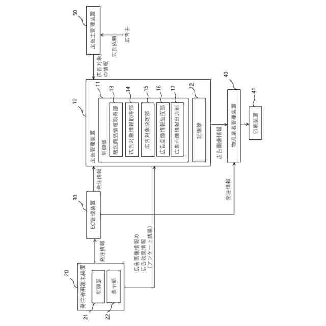 【解決手段】商品が梱包される梱包材に印刷される広告対象の属性情報を取得する広告対象情報取得部14と、梱包材の受取人の属性情報を取得する梱包商品情報取得部13と、広告対象の属性情報に基づいて広告対象の象徴的な画像を生成し、受取人の属性情報に基づいて象徴的な画像以外の部分の非象徴的な画像を生成し、象徴的な画像および非象徴的な画像とを組み合わせて広告画像情報を生成する広告画像情報生成部16とを備える。