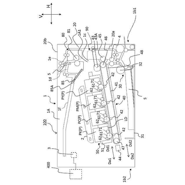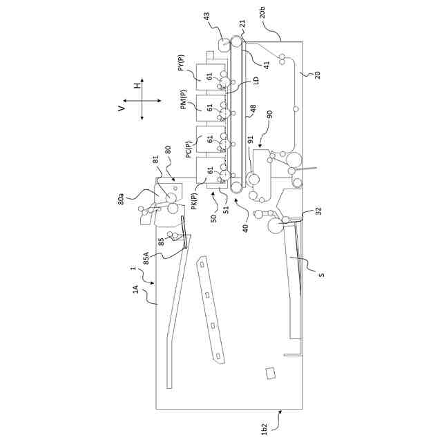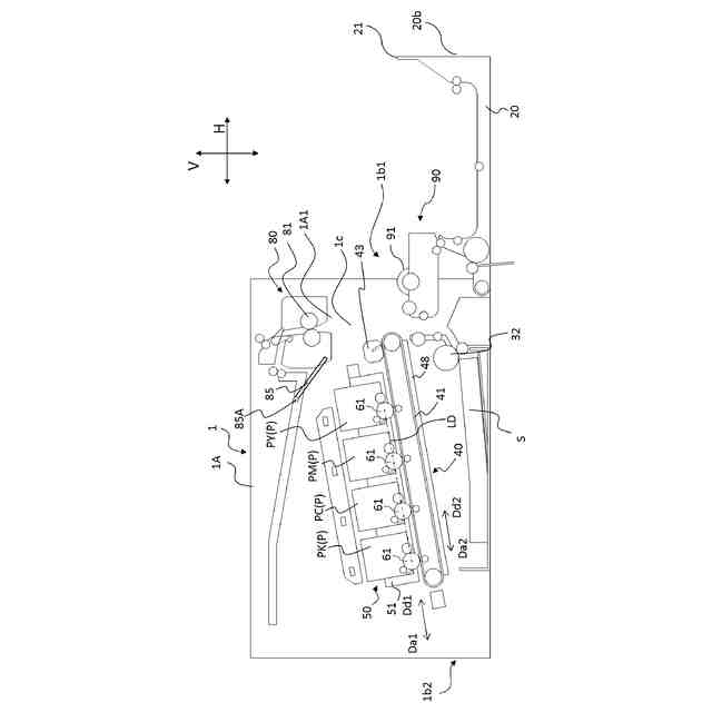 実施例1のドアおよび二次転写ユニットを開いた状態のプリンタを示す図