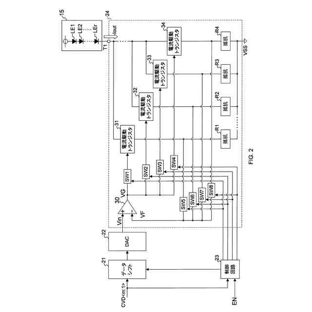 【解決手段】発光ダイオードに接続された外部端子と、各々のドレインが外部端子に接続された複数のトランジスタと、複数のトランジスタの各々に対応して設けられ、各々の一端が複数のトランジスタのうちの対応するトランジスタのソースに接続され、他端が基準電圧の電圧供給ラインに接続されている複数の抵抗と、発光ダイオードの電流値設定データに基づいて電圧信号を生成する電圧信号生成部と、第1入力端に電圧信号の入力を受けるとともに、電圧信号の電圧と帰還電圧との差分に応じた電圧を駆動制御電圧として複数のトランジスタのゲートに出力する出力端を有する差動増幅器と、電流値設定データに基づいて、複数のトランジスタのゲートと差動増幅器の出力端との接続及び非接続を切り替える制御部とを有する。