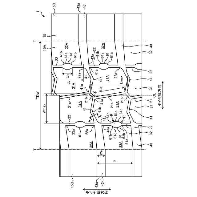 【解決手段】少なくとも1本の周方向細溝21,22は、幅が広い拡張部61aと当該拡張部から周方向細溝に対して滑らかに繋がる連結部61bとを含んで深さが一定に形成される拡幅部61を有し、幅方向細溝41とショルダーラグ溝43は端41a,43aが対向して配置され、各細溝21,22,41は、自身の溝幅が、自身の溝深さに対して10[%]から25[%]で、センター周方向細溝は、長尺部21aと短尺部21bとをタイヤ周方向に交互に配置したジグザグ形状に形成され、長辺部は、その長さが、センターブロック31Aのタイヤ周方向最大寸法に対して65[%]以上100[%]以下であり、ショルダーブロック32Aは、タイヤ周方向に並ぶ個数が28以上43以下で、トレッド部は、タイヤ赤道面CLにおけるセンタートレッドゲージが40[mm]以上で、センタートレッドゲージは、ショルダーラグ溝の溝深さに対して105[%]から185[%]である。