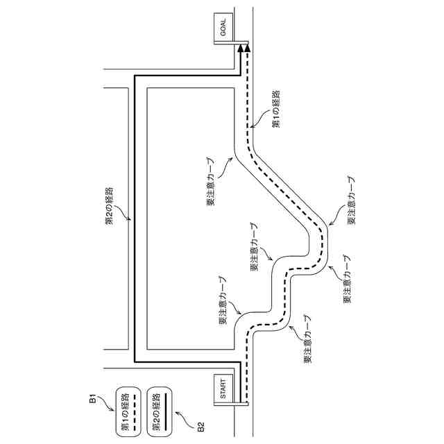 上記課題を解決するために、請求項1に記載の発明は、出発地点に関する情報を取得する出発地点情報取得処理部と、目的地点に関する情報を取得する目的地点情報取得処理部と、前記出発地点から前記目的地点までの経路を探索する経路探索部と、を有し、前記経路探索部は、曲率半径の値が第1の曲率半径値より小さい所定のカーブを含む第1の経路、および前記所定のカーブを含まない第2の経路の少なくともいずれか一方を探索する。