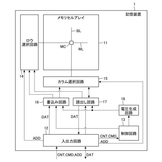 図1は、第1実施形態の記憶装置の機能ブロックを示す。記憶装置1は、データを記憶する装置である。記憶装置1は、磁気記憶装置であり、動的に可変な抵抗を示す磁性体の積層体を用いてデータを記憶する。図1に示されているように、記憶装置1は、メモリセルアレイ11、入出力回路12、制御回路13、ロウ選択回路14、カラム選択回路15、書込み回路16、読出し回路17、及び電圧生成回路18を含む。