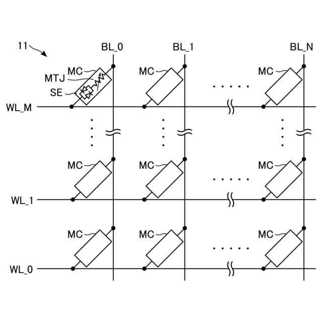メモリセルアレイ11は、配列された複数のメモリセルMCの集合である。メモリセルMCは、データを不揮発に記憶することができる。メモリセルアレイ11中には、複数の第1種類の配線及び複数の第2種類の配線が位置している。以下の記述において、第1種類の配線及び第2種類の配線の一方は、ワード線WLと称され、他方はビット線BLと称される。以下の記述は、ワード線WLが行(ロウ)と関連付けられているとともにビット線BLが列(カラム)と関連付けられている例に基づく。各メモリセルMCは、1つのワード線WL及び1つのビット線BLと接続されている。1つの行の選択及び1つの列の選択により、1つのメモリセルMCが選択される。