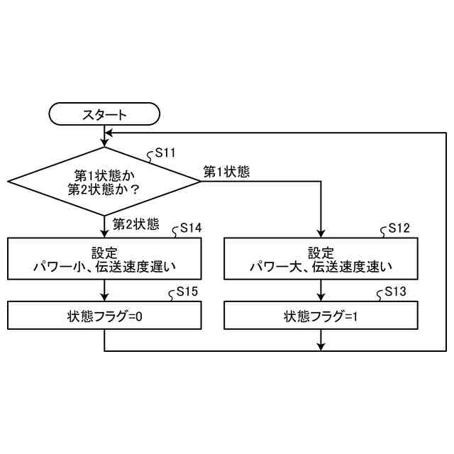 前記読取制御手段は、前記第1状態で出力した前記電波に含まれる情報の伝送速度を速く設定し、前記第2状態で出力した前記電波に含まれる情報の前記伝送速度を遅く設定する、