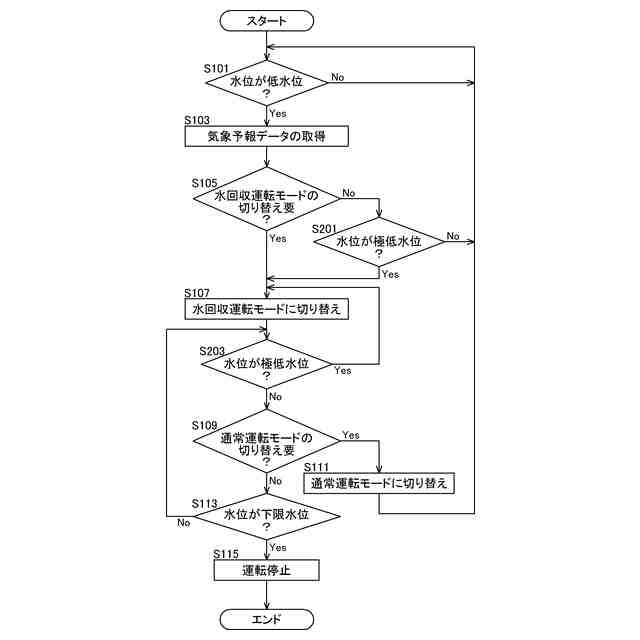 前記水量が前記第2水量閾値以下であると判定すると、前記気象予報データに関わらず、前記運転モードを前記通常運転モードから前記水回収運転モードに切り替え、