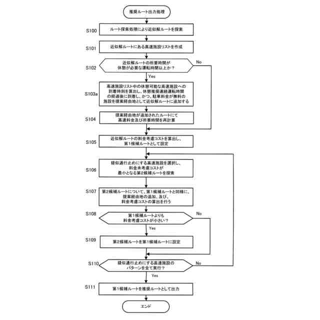 また、請求項に記載の発明は、プログラムであって、出発地及び目的地を取得し、前記出発地から前記目的地に至る複数の経路について、前記目的地までの所要時間又は距離、有料道路の通行料金、及び有料道路における駐車施設の駐車料金、のそれぞれについてのコストを含む総コストを計算し、前記総コストが最も小さい経路を含む1又は複数の経路のうち、少なくとも前記駐車施設の駐車料金が最も安い経路を推奨経路として出力する処理をコンピュータに実行させる。