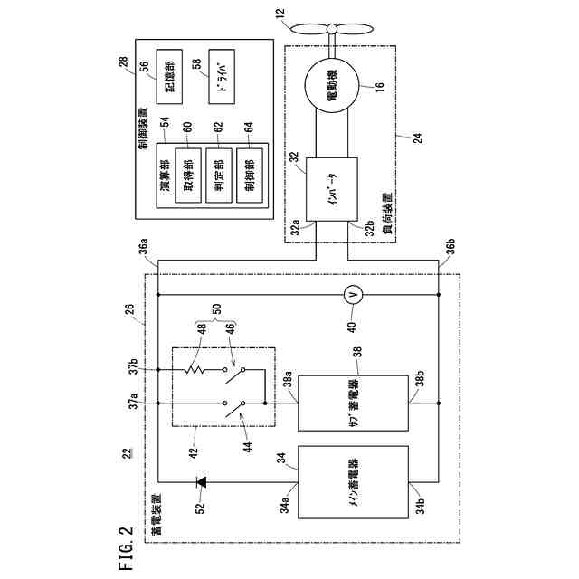 前記飛行体には、前記負荷装置に電力を供給可能なメイン蓄電器と、前記負荷装置に電力を供給可能であるとともに前記メイン蓄電器よりも質量が小さいサブ蓄電器と、が備えられ、