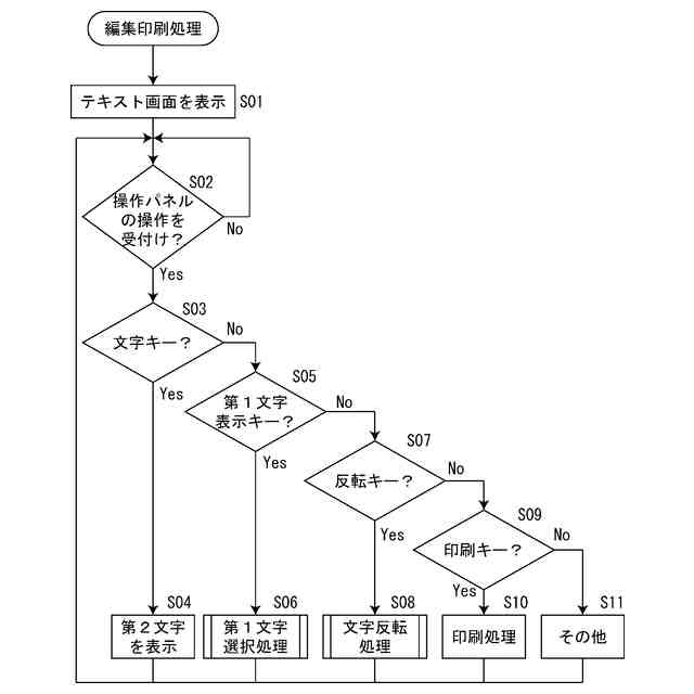 【解決手段】制御部は、第1文字選択画面から選択された第1文字が、印刷されるテキスト201を構成する文字としてテキスト画面D1に表示されるように、選択された第1文字を表す画像データに基づいて、表示部を制御し、制御部は、第1文字が文字反転をした第1反転文字211を、第1文字に代えてテキスト画面D1に表示させる反転指示を受け付け、制御部は、反転指示を受け付けたときに、第1文字を表す画像データに基づいて、第1反転文字211を表す第1反転画像データを生成し、制御部は、第1反転文字211がテキスト201を構成する文字として第1文字に代えてテキスト画面D1に表示されるように、生成した第1反転画像データに基づいて、表示部を制御する。