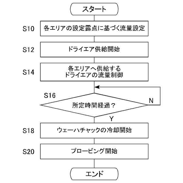 【解決手段】ある態様のプローバ1は、ウェーハに形成された半導体デバイスの電気的特性を検査する。プローバ1は、結露を防止するための設定露点が異なる複数のエリア40,42,15と、その複数のエリアのそれぞれにドライガスを供給する供給部100と、供給部100によるドライガスの供給を制御する制御部20と、を備える。制御部20は、複数のエリア40,42,15のそれぞれの設定露点を実現するよう、各エリアへのドライガスの供給を制御する。