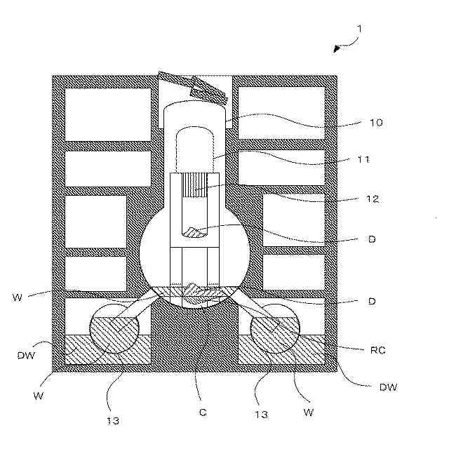 この場合、原子炉格納容器10の一部も溶融され、穴が開いて圧力抑制室13の外部にまで冷却水Wが漏れ出て廃棄水DWを生じさせる。また、圧力容器11を支える底部の材質Cを劣化させ、劣化材質RCが生成させる。
