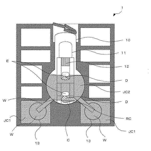 核燃料溶融事故が起きた場合、核燃料12の冷却が阻害され、高温になった核燃料12は核燃料の容器等とともに溶融して自重により落下し、冷えてデブリDが生成される。デブリDは、原子炉格納容器10の底部にも溶け落ちて固化することもある。