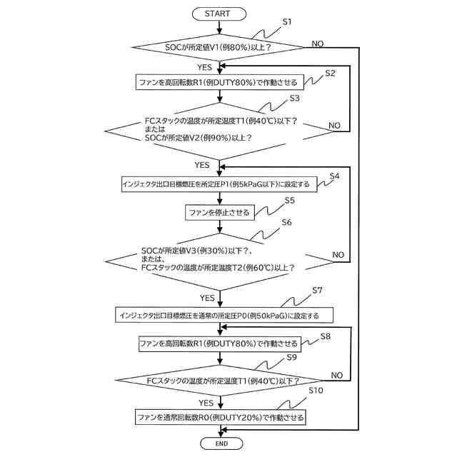 【解決手段】本開示の一態様は、燃料電池システム1において、制御部14は、バッテリ12のSOCが所定値V1以上である間欠停止要求時にて、ファン83を高回転数R1で作動させて、すなわち、ファン83の供給量をFCスタック11の発電時の量よりも多くして、FCスタック11を冷却する冷却制御を行った後に、ファン83を停止させる間欠停止制御を行う。