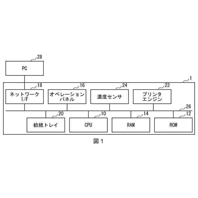 図1にプリンタ1のハードウェア構成を示すように、プリンタ1は、CPU10、ROM12、RAM14、オペレーションパネル16、ネットワークI/F18、給紙トレイ20、プリンタエンジン22及び濃度センサ24を有しており、これらがプリンタバス26を介して相互に接続されている。