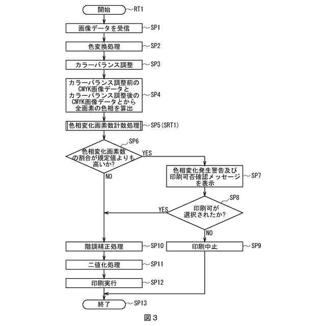 【解決手段】画像データの色相調整を行うカラーバランス調整部38と、カラーバランス調整部38による色相調整の前後の画像データの各画素の色相の変化量と画素値の変化量とに基づいて報知を行う報知部46と、を有するプリンタ1であって、報知部46は、色調整の前後の色相の変化量が色相閾値以上であり、かつ、色調整の前後における、画素値の変化量が最大のチャネルと最小のチャネルの変化量との差分がチャネル間画素値差閾値以下である画素の画素数を計数して、画像データ中の全画素数に対する該画素数の割合が画素数閾値よりも高い場合に報知を行う。